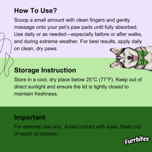 Usage Instruction: Scoop a small amount with clean fingers and gently massage onto your pet’s paw pads until fully absorbed. Use daily or as needed—especially before or after walks, and during extreme weather. For best results, apply daily on clean, dry paws.