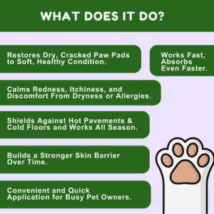 All-in-One Hydration: One cream, all the care. This deeply hydrating formula delivers instant relief from dryness while feeding paws with natural nourishment. Packed with rich butters and oils, it absorbs quickly to soften rough skin, heal cracks, and restore comfort—no greasy residue, just happy paws.