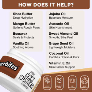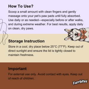 Usage Instruction: Scoop a small amount with clean fingers and gently massage onto your pet’s paw pads until fully absorbed. Use daily or as needed—especially before or after walks, and during extreme weather. For best results, apply daily on clean, dry paws.