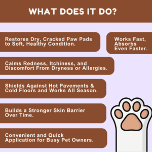 Complete Pawtection For Complete Care: Give your pet the ultimate paw care with our all-in-one formula that provides complete protection. From moisturizing dry paws to shielding against harsh weather, it offers all-around care for healthier, stronger paws. Perfect for daily use, it helps repair and prevent damage caused by rough surfaces, cold temperatures, and environmental irritants. Ensure your pet’s paws stay protected and nourished, no matter the season.