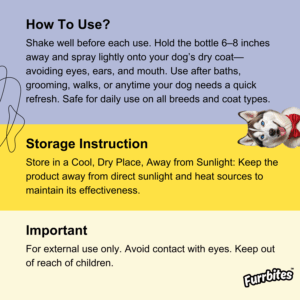 Direction of Use: Shake well before each use. Hold the bottle 6–8 inches away and spray lightly onto your dog’s dry coat—avoiding eyes, ears, and mouth. Use after baths, grooming, walks, or anytime your dog needs a quick refresh. Safe for daily use on all breeds and coat types.