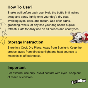 Direction of Use: Shake well before each use. Hold the bottle 6–8 inches away and spray lightly onto your dog’s dry coat—avoiding eyes, ears, and mouth. Use after baths, grooming, walks, or anytime your dog needs a quick refresh. Safe for daily use on all breeds and coat types.