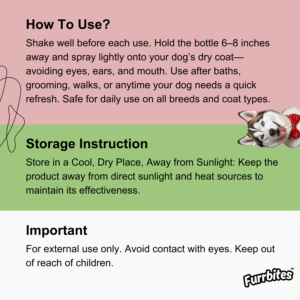 Direction of Use: Shake well before each use. Hold the bottle 6–8 inches away and spray lightly onto your dog’s dry coat—avoiding eyes, ears, and mouth. Use after baths, grooming, walks, or anytime your dog needs a quick refresh. Safe for daily use on all breeds and coat types.